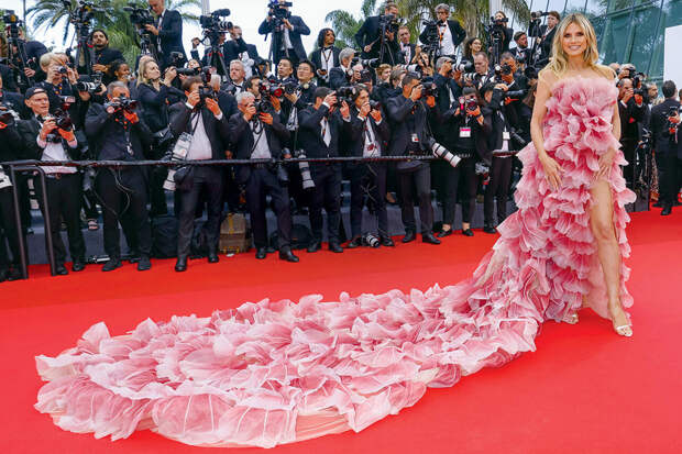 «Хайди Клум в невероятном розовом наряде. Чрезвычайно эпатажный выход. Хайди очень захотела всем запомниться, и ей это удалось. Но, к сожалению, в этом наряде не видно самой Клум. «Розовое безумие» довольно-таки невразумительной формы напрочь скрывает от нас фигуру актрисы и модели.