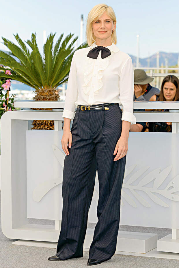«Перед нами самый трендовый цвет этого лета — оттенок сливочного масла или лимонного сорбета. Это один из главных хитов нынешнего сезона. Мне нравится выбор этого цвета. Как и то, что актриса Жюльет Бинош надела не какое-то помпезное вечернее платье. В таком виде можно попозировать фотографам, а потом отправиться пить кофе где-нибудь на набережной Круазетт. Этому выходу я точно ставлю «лайк». По соседству с Бинош режиссер и актриса Мелани Лоран в прекрасном комплекте. Очень люблю сочетание белой рубашки, брюк и какого-то подобия бабочки. Рубашка не выглядит протокольной, у нее мягкая фактура и воланы. Отдельно хочу отметить подвороты на рукавах, что позволяет продемонстрировать браслеты либо часы. Или показать запястья — это всегда очень женственно».