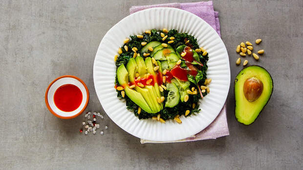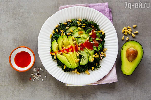 «Нарезать кубиками огурцы (2 шт.), очистить и освободить от косточки авокадо (2 шт.), нарезать кубиками. Стебли сельдерея (2 шт.) нарезать ломтиками. Листья салата (200—250 г) порвать на кусочки руками. Все ингредиенты перемешать в глубокой миске, добавить оливковое масло (2 ст. л.), соль (по вкусу), кедровые орешки (30 г) и мягкий сыр (2 ст.