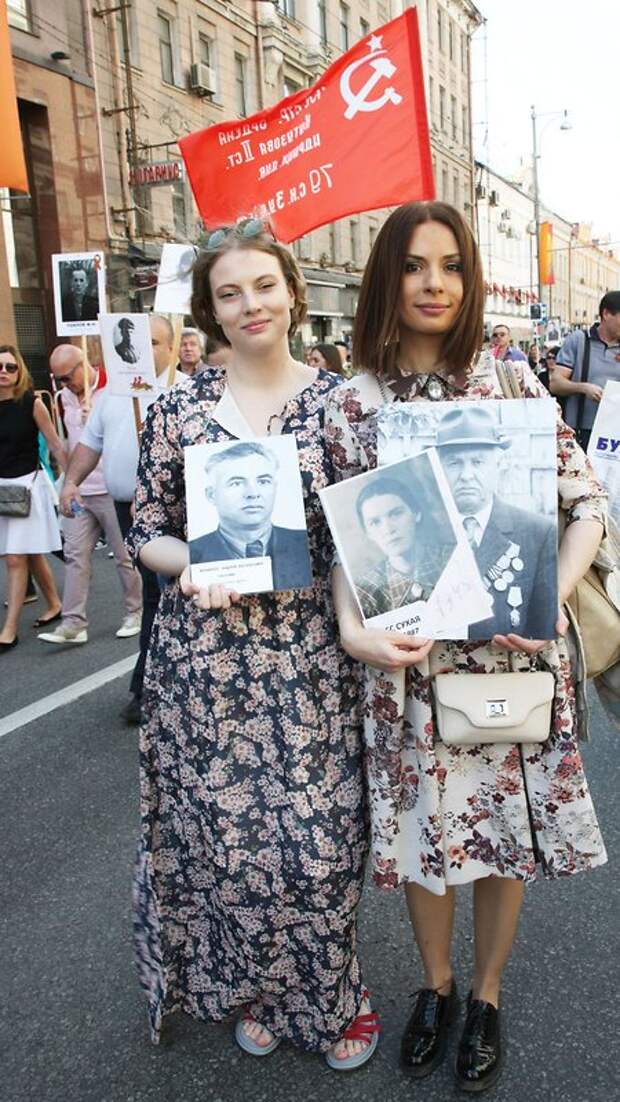 Сегодня многие звезды вышли на улицы Москвы с портретами своих героических родственников, которые в годы Великой Отечественной Войны на фронтах и в тылу приближали Победу.