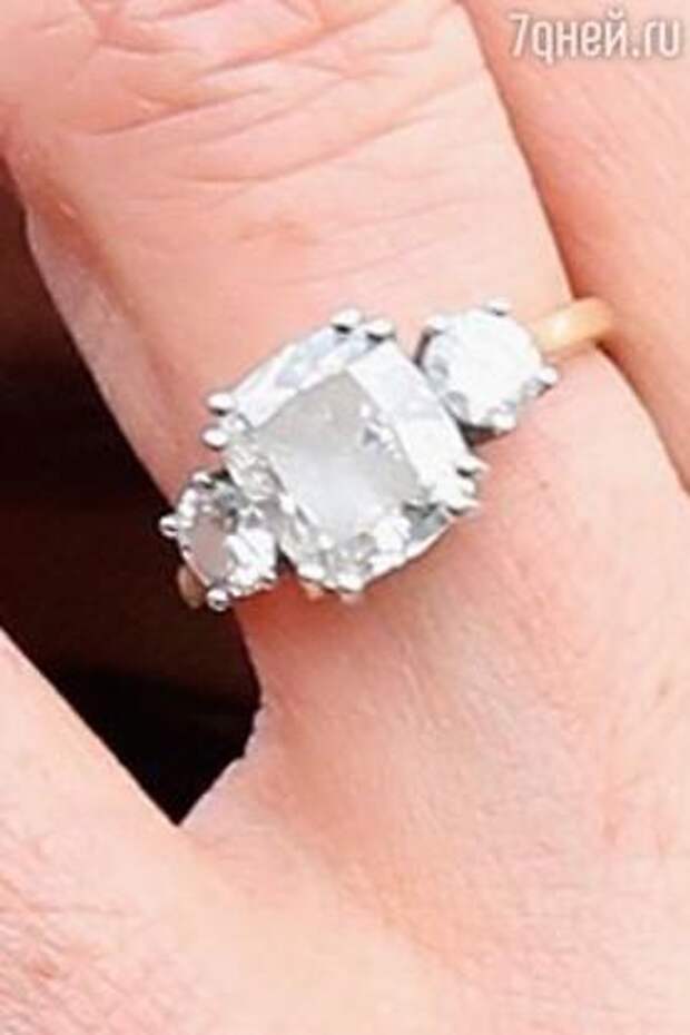 Однако, когда все вдоволь налюбовались на новое кольцо, то заметили, что старое — помолвочное — изменило свой вид. Раньше оно представляло собой не слишком узкий ободок из желтого золота, украшенный тремя крупными бриллиантами. Теперь же эти камни закреплены на совсем тоненьком колечке из белого металла, густо усеянном мелкими сверкающими драгоценными камнями.
